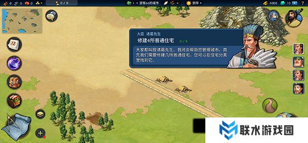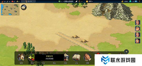 4. 第一个任务是建造四所住宅。点击右下角的斧头按钮,选择普通住宅,并将其拖动到任务指定位置,建筑完成需要一定时间。