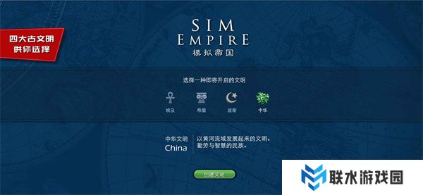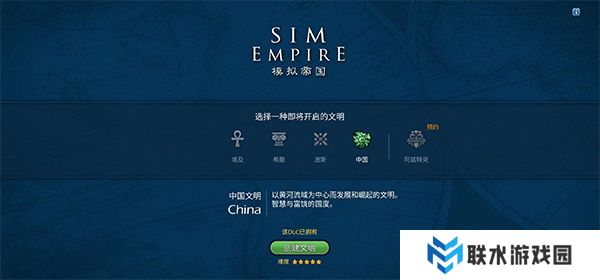 1. 在本站下载安装并登录游戏后,首先需要创建一个文明。这里小编选择了中国,玩家可以根据自己的喜好选择不同的文明。