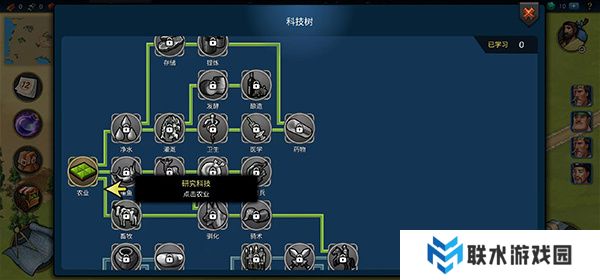 7. 随着人口的增加,国家的发展更为重要,因此此时需要加强科技研究。点击左侧的药品图标,开始研究新的科技。