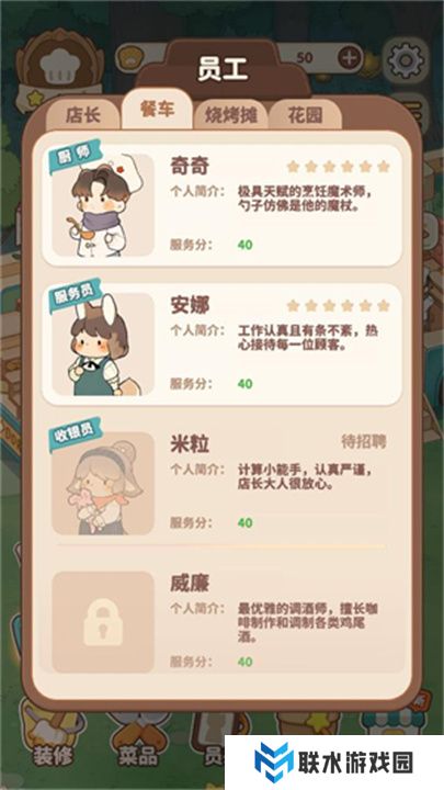 -员工是餐厅成功的重要因素。在员工招募区,花费金币招募不同的员工,或者为现有员工提供培训,提升他们的服务技能,让餐厅运营更加高效!
