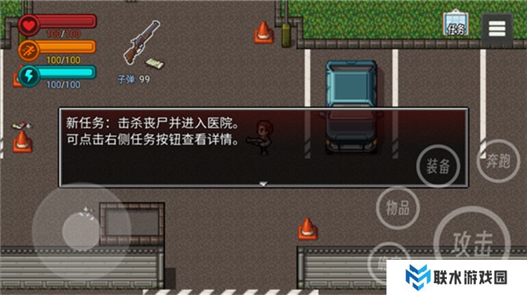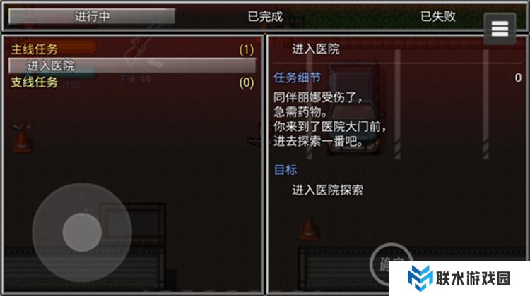 3、游戏中会出现新任务,如“击杀丧尸并进入医院”,点击右侧任务按钮查看详细信息。
