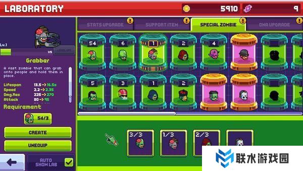 在实验室界面,使用DNA点数解锁新的变异类型,如快速感染者、跳跃型僵尸等。