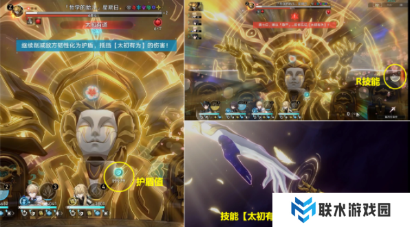 2、所以想要护盾值高,可以到第3阶段时提前留好角色的大招,带上破boss韧性条快的角色,R技能留到第3阶段时再放,也别把boss的韧性条打完,要让boss释放出技能「太初有为」;