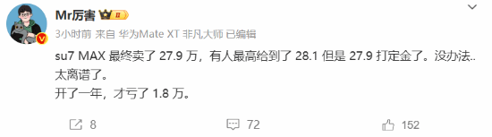 微博博主@Mr厉害 分享了自己小米SU7 Max售卖的情况,他表示原价近30万的小米SU7 Max,卖了27.9万,开了一年只亏了1.8万。 他还遗憾的表示,甚至有人出价到最高28.1万,可惜已经提前拿到27.9万的定金出手了。