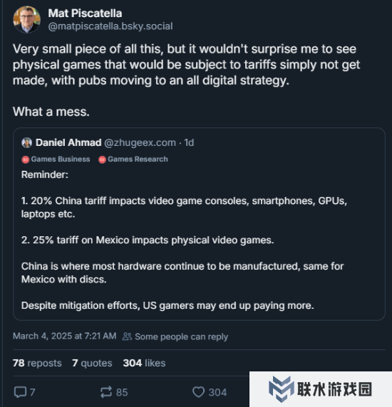 另一名分析师马特·皮斯卡特拉则分享了另一个观点:由于墨西哥关税上涨,实体游戏行业可能遭受巨大打击,并从货架上消失。