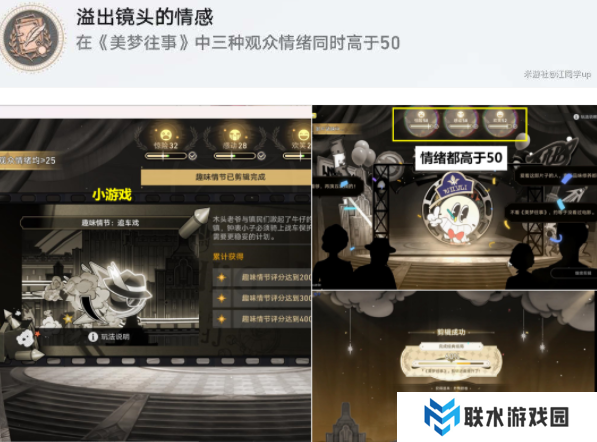1、完成《美梦往事》第三阶段的【迷梦大冒险,经典结局】第1章和第2章后,都会出现1个很简单的小游戏,当第3章最后3种观众情绪同时高于50后,再完成最后的(经典结局)后,即可获得成就《溢出镜头的情感》;