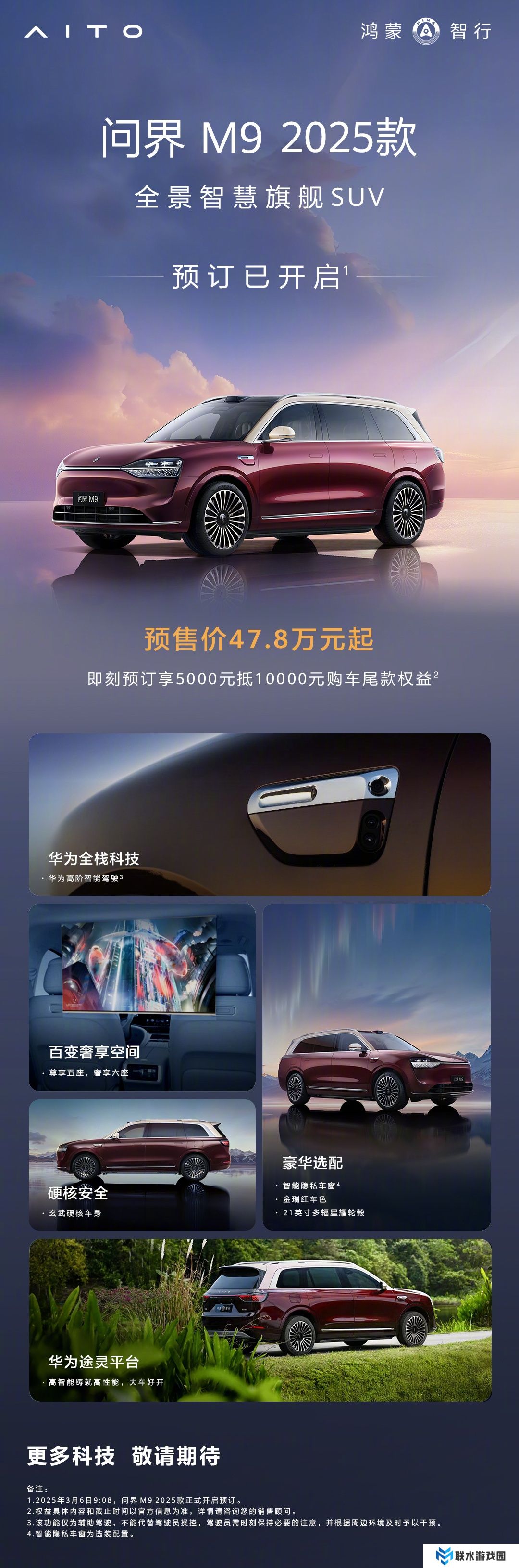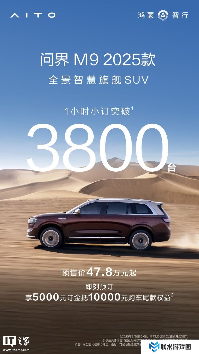 本站 3 月 6 日消息,鸿蒙智行今日官宣 2025 款问界 M9 开启预订,预售价 47.8 万元起,本月上市。据问界汽车官方消息,问界 M9 2025 款 1 小时小订突破 3800 台。