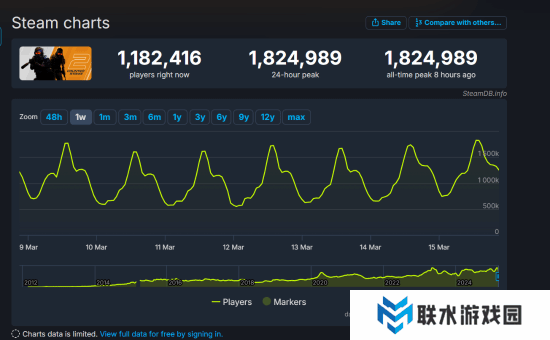 根据SteamDB数据显示,就在昨晚,知名射击游戏《CS2》的在线人数峰值突破182万人,来到182.4989万,刷新了此前的历史记录。截止至发稿时,仍有超过118万的玩家在游戏中!