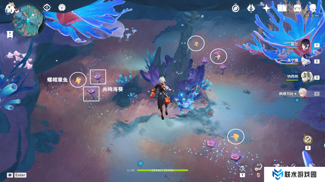 2、靠近螺帽章鱼,待其靠近共鸣海葵(2个都发光)时: