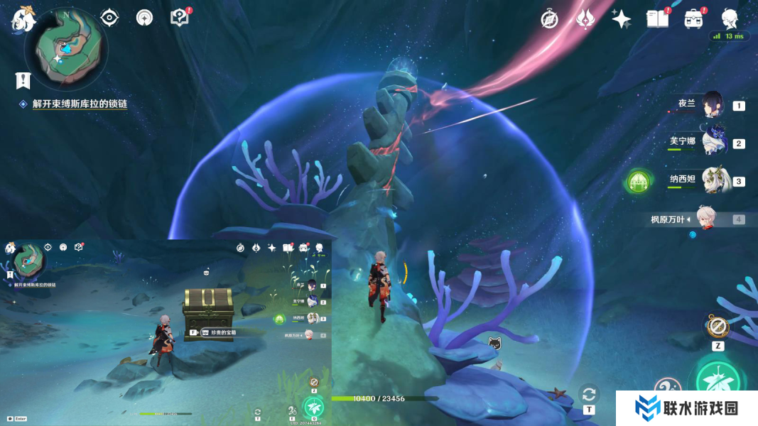 1、按图中指引路线游,开启海底锚点,前往洞口;