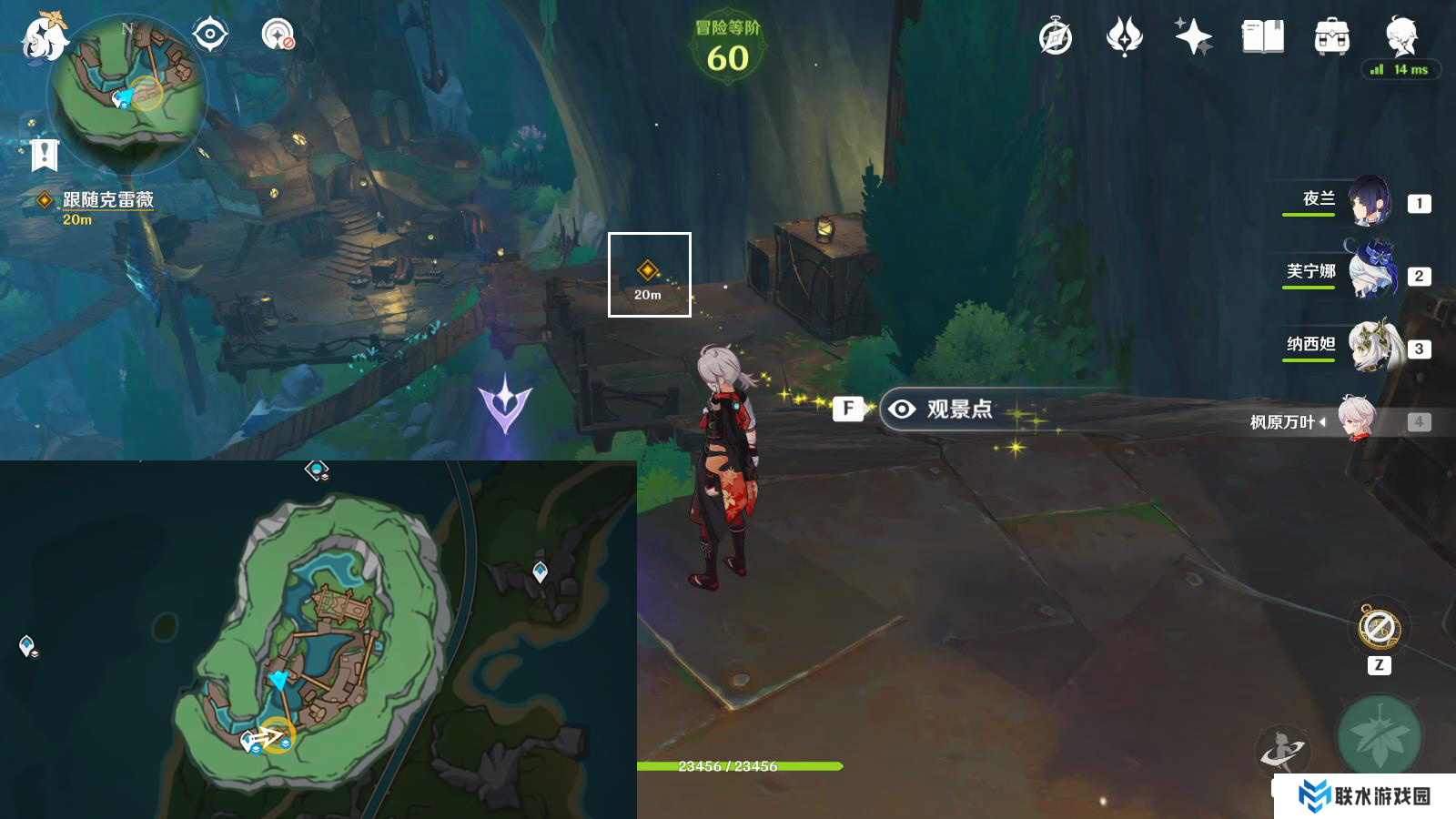 3、跟随克雷薇传送白淞镇锚点,往地图的东北方向飞,前往上层平台;