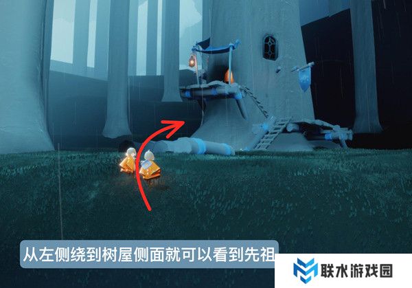 2、转向左侧的树屋,并朝其飞去。请注意绕到树屋的背后,以寻找目标先祖。
