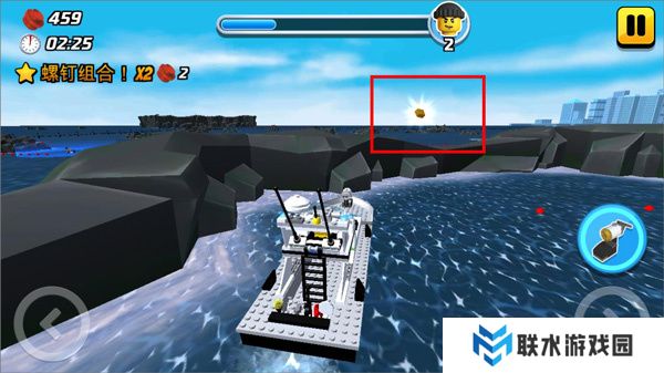 在海上**关卡中,玩家需要选择海上交通工具开始追捕坏人。金砖位于海上的礁石圈内,玩家需要控制交通工具进入金砖范围,利用附近的跳板提升高度,并朝金砖的方向控制飞行,成功获取金砖。