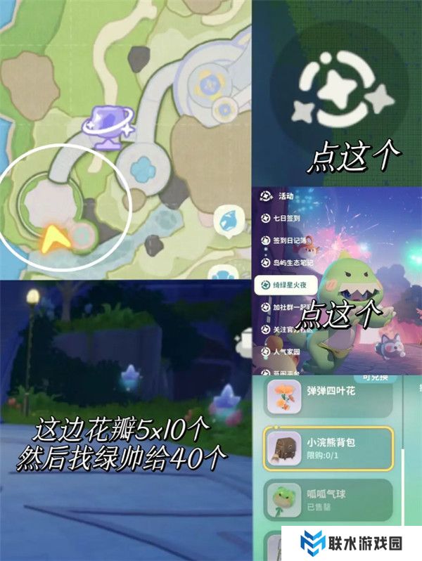 每天晚上7点不要忘了去看烟花哦。在地图上找到金发美女,她会给你10次花瓣,总共50个。而且参与找绿帅小游戏也能得到40个花瓣。兑换页面上有好多好东西等你,比如四叶草、浣熊背包、绮夜探灯和青蛙气球灯等。