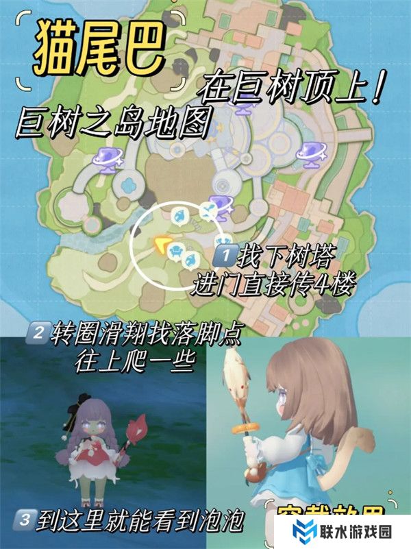 猫尾巴应该是大家都知道的,位于巨树之岛的巨树附近。如果你还没拿到,可以先传送到巨树塔的四楼,接着往上跳,找个稳当的地方慢慢跳上去,猫尾巴就到手了。