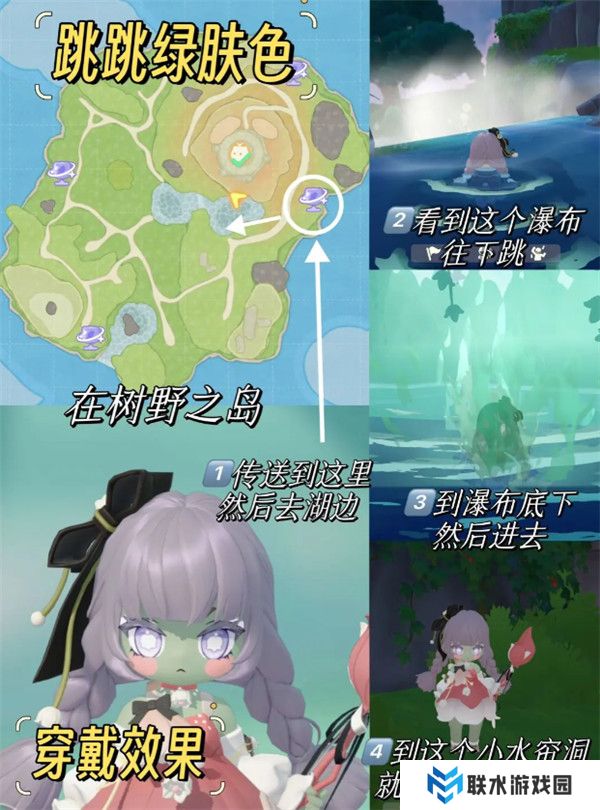 这个绿肤色外形藏在树野之岛。找到如图标记的传送点后,往湖边的瀑布跳过去,跳进瀑布后面的水帘洞里就能获得啦。这个地方真是个疗愈的好去处,以后肯定常来放空心情。