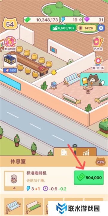 -首先,别忘了完成任务,解锁这个舒适的休息区。一旦进去了,你就会发现有个标准咖啡机等着你。别急,建设咖啡机是需要花费一定的金钱的,所以准备好资金,开始你的投资吧!