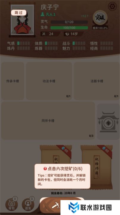 1、下载安装并进入游戏后,点击【挖矿】按钮,自动获取资源,同时消耗时间寿元。