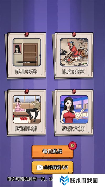 1. 打开游戏,进入主界面后,可以看到多个玩法选项,如“诡异事件”、“眼力找茬”、“脑洞比拼”、“砍价大师”,以及每天更新的“每日挑战”。这里我们以【每日挑战】为例。