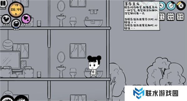 在遇到第一个关键选择时,游戏问我对作业的态度是怎样的,是认真痛苦地学习,还是该玩就玩。我选择了“玩玩玩”,于是获得了“享乐主义”Buff。这个Buff的作用是在娱乐值较高时,心情值会以2级的增长速度增加。