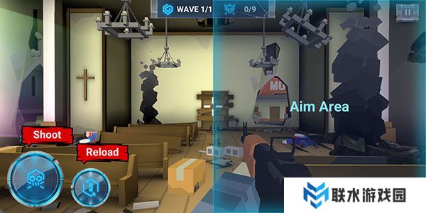 操作控制:进入关卡后,拖动右侧屏幕以移动准星,左侧为射击和换弹按钮。